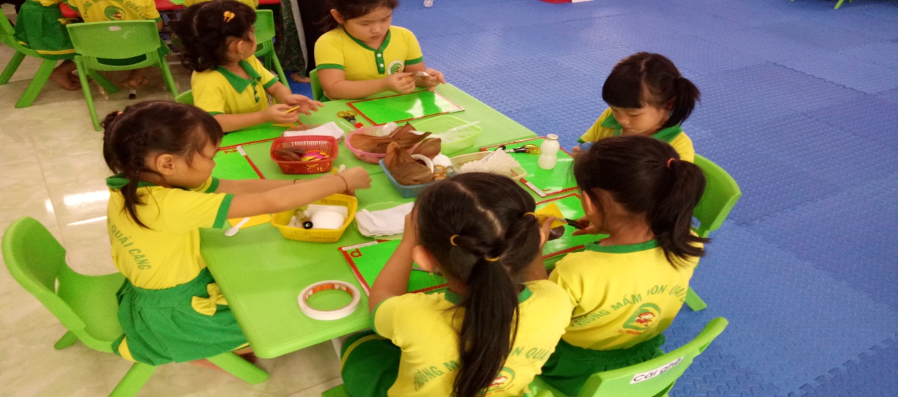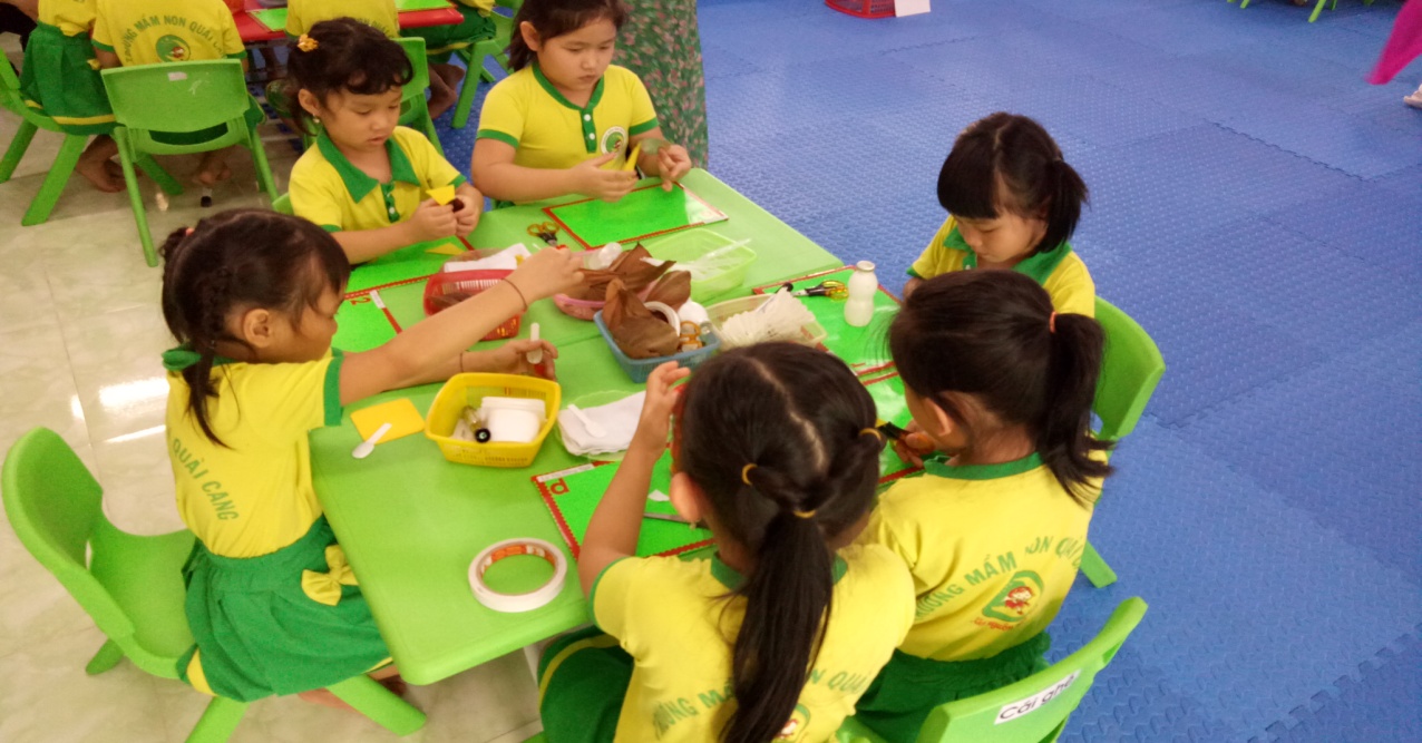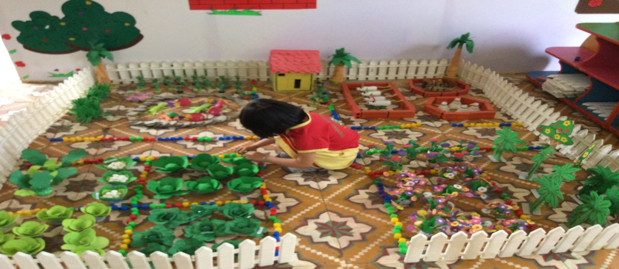 Hình ảnh trẻ sử dụng nguyên vật liệu mở làm đồ chơi*Môi trường bên ngoài lớp họcMôi trường ngoài lớp học là yếu tố góp phần tích cực trong các hoạt động nâng cao chất lượng chăm sóc giáo dục toàn diện trẻ. Xây dựng môi trường ngoài lớp học phù hợp, an toàn, sạch đẹp, hấp dẫn sẽ tạo cơ hội cho trẻ hoạt động, đáp ứng nhu cầu chơi của trẻ.Khi bố trí các góc/khu vực hoạt động ngoài trời cần lưu ý: Các góc/khu vực hoạt động ngoài trời cần được xác định rõ ràng; mỗi góc/khu vực hoạt động có nhiều loại học liệu, đồ chơi và phương tiện, trong đó có loại đặc trưng cho từng góc/khu vực, tạo cơ hội cho trẻ tham gia hoạt động; đồ chơi, học liệu, trang thiết bị ở các góc/khu vực hoạt động đảm bảo an toàn, vệ sinh: không có đồ sắc nhọn, không độc hại, được vệ sinh sạch sẽ, được bảo dưỡng định kì, sửa chữa kịp thời, tạo hình ảnh và ấn tượng riêng của trường/lớp.