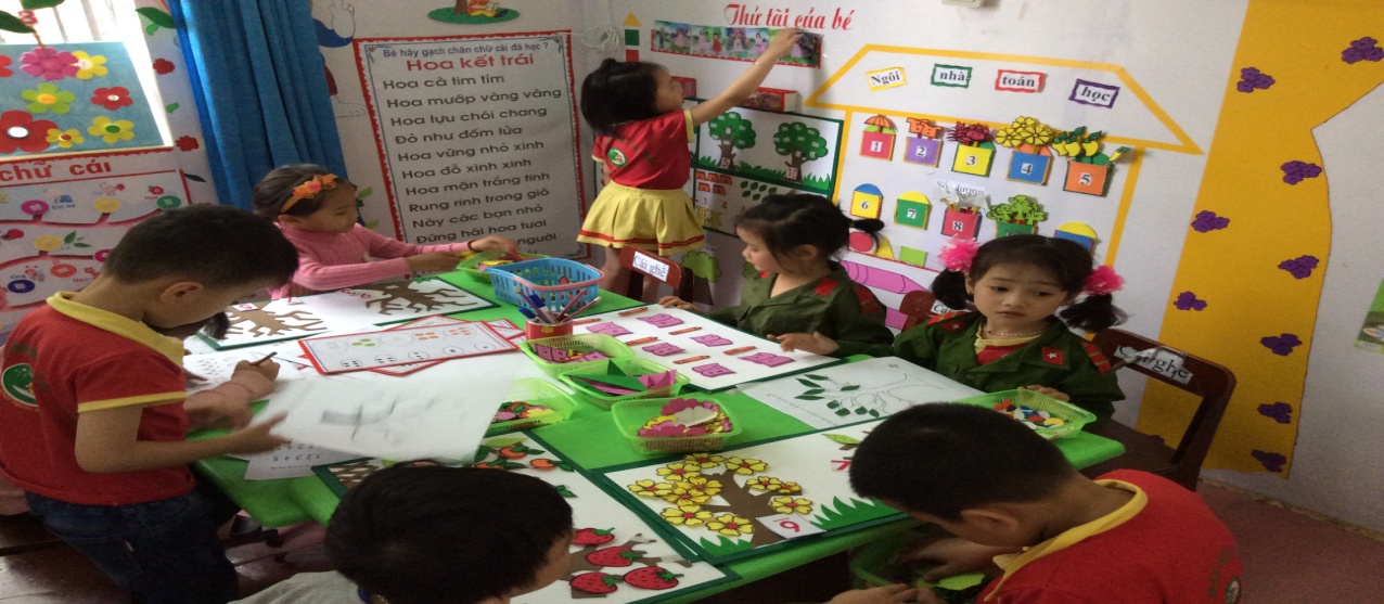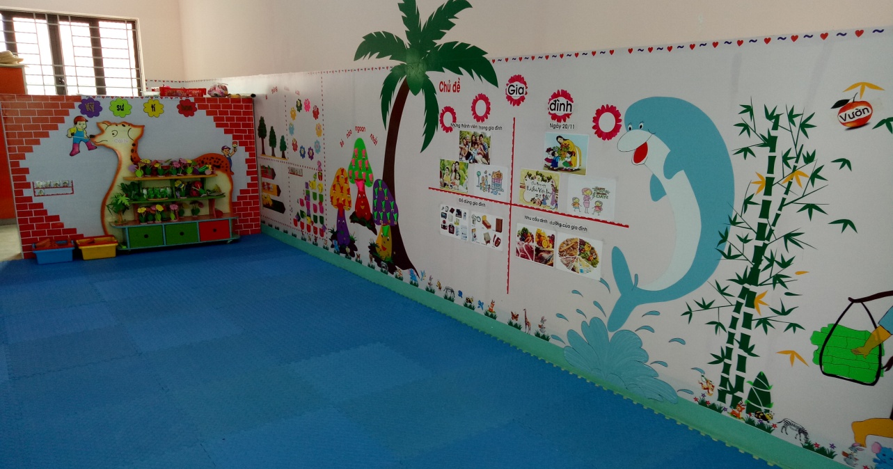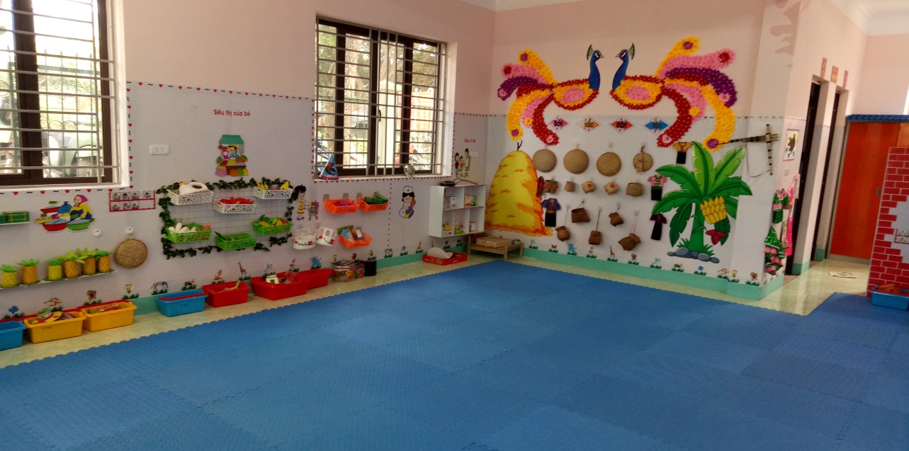(Hình ảnh bố trí các góc ở trong lớp)Đồ dùng, đồ chơi, nguyên vật liệu, học liệu có giá đựng ngăn nắp, gọn gàng, để ở nơi trẻ dễ thấy, dễ lấy, dễ dùng, dễ cất. Đồ dùng, đồ chơi, nguyên vật liệu được thay đổi và bổ sung phù hợp với mục tiêu chủ đề/hoạt động và hứng thú của trẻ.Có nguyên vật liệu mang tính mở (lá cây, hột hạt…), sản phẩm hoàn thiện, sản phẩm chưa hoàn thiện…Có sản phẩm mua sẵn, sản phẩm cô và trẻ tự làm, sản phẩm của địa phương đặc trưng văn hóa vùng miền (trang phục, dụng cụ lao động, nghề truyền thống…)Đồ dùng, đồ chơi, nguyên vật liệu an toàn, vệ sinh, phù hợp với thể chất và tâm lí của trẻ mầm non. Học liệu, thiết bị, đồ chơi được điều chỉnh để hỗ trợ trẻ khuyết tật (nếu có).